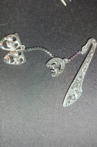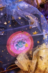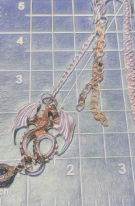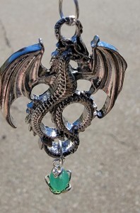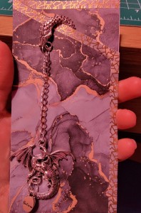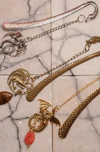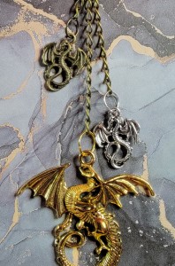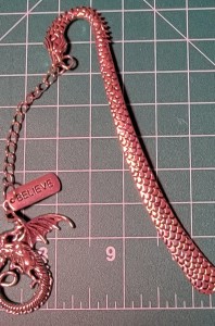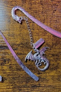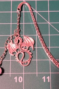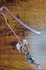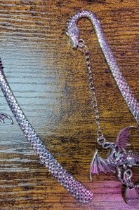 Literary Links are often what I call my unique bookmark bracelet system. I hand make my bracelets adding split rings to ensure sturdy attachment to the clasps. I offer traditional toggle bracelet ends and my more popular “magnetic” ends. I don’t know about you, but I absolutely suck at putting on a traditional toggle–which is why I mainly offer magnetic ends on my bracelets these days. Some of my sets also have a dragon that converts into a brooch. These bracelet sets also make unique wine glass charms. Just pop the bracelet off, wrap around the stem of your glass, and voila instant glass identification!